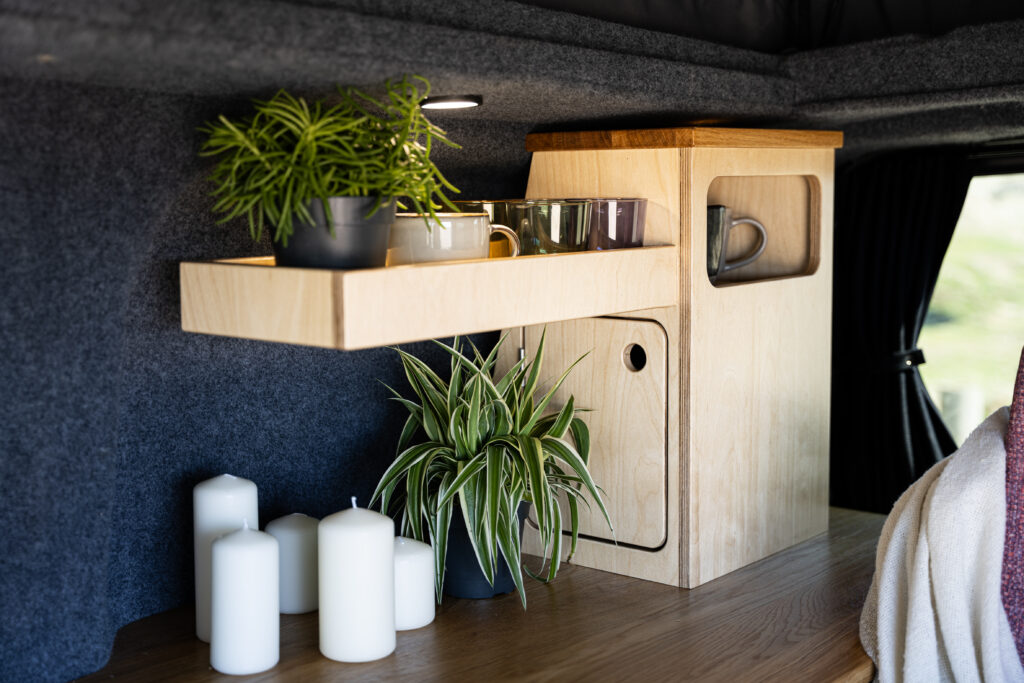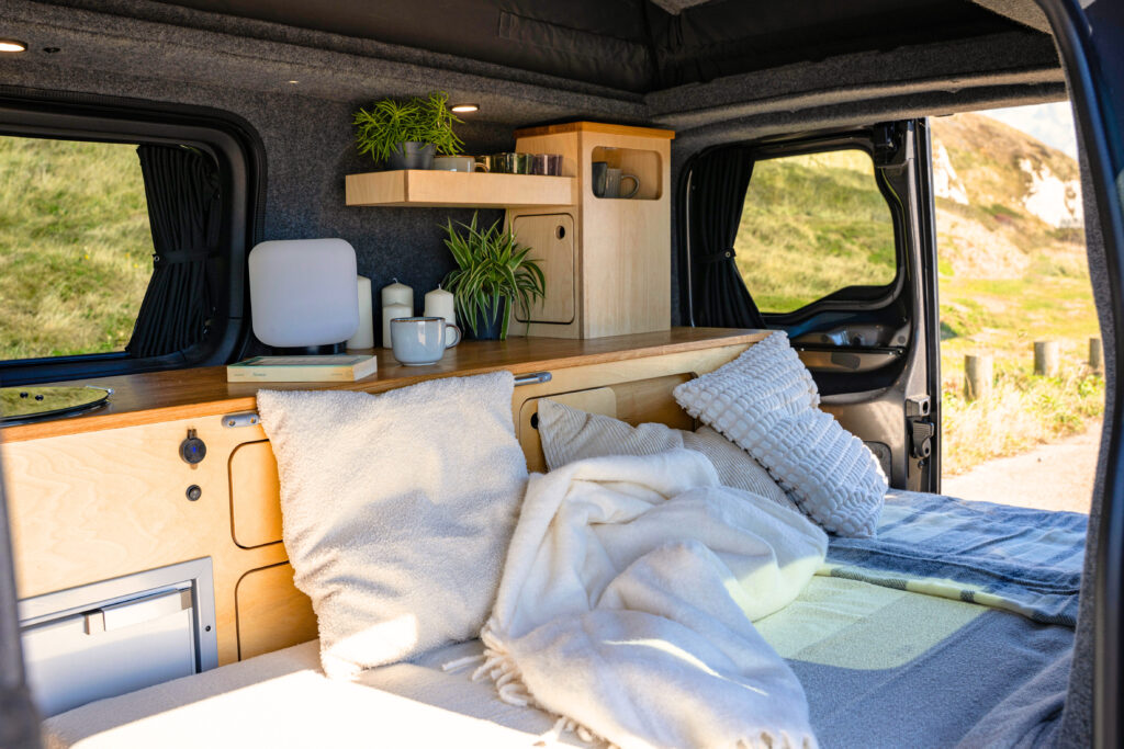 Our Fiat E-Scudo conversion already embodies these principles with its birch ply furniture and anthracite grey carpet lining. This is our Mandalay design, one of our most popular layouts for small to medium electric vans. Adding carefully selected IKEA soft furnishings elevates the space from practical to beautiful, proving that van life doesn’t mean compromising on style.