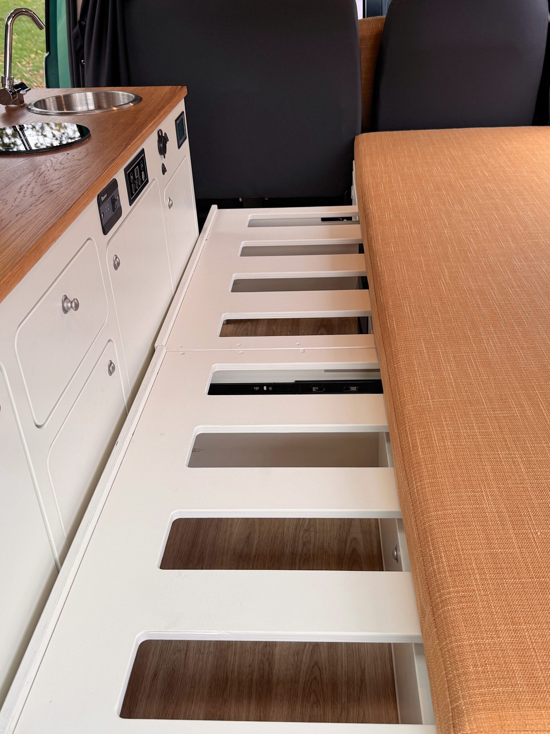 Our vans feature hand-built wooden furniture throughout. No flat-pack, no shortcuts. Skilled carpenters create solid wood worktops, cabinets, and tables that are built to last and lovely to live with.