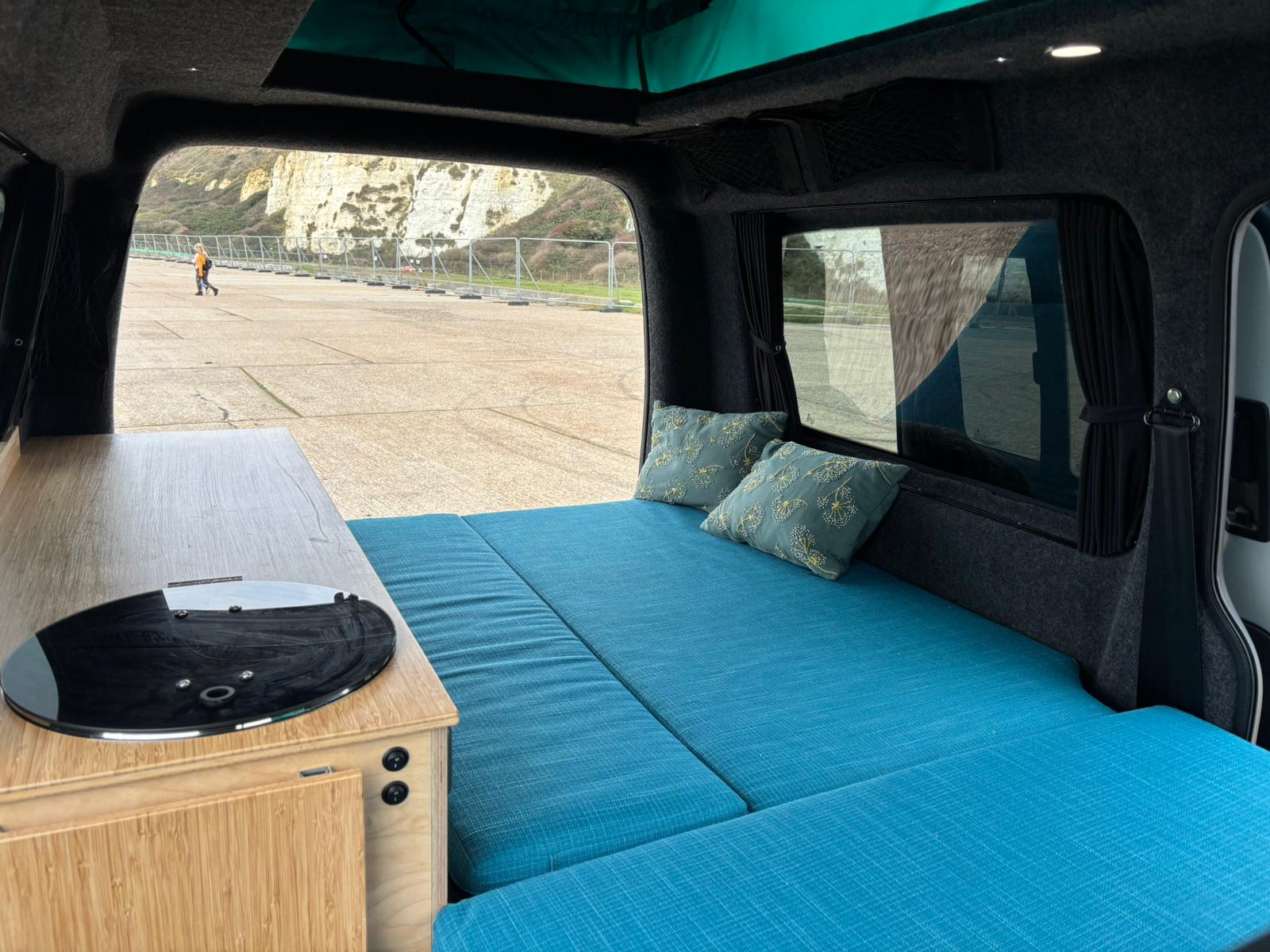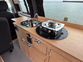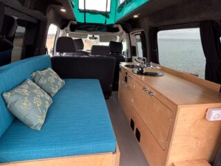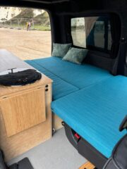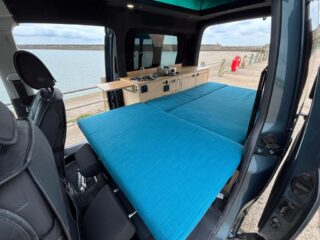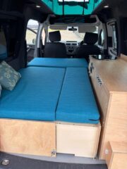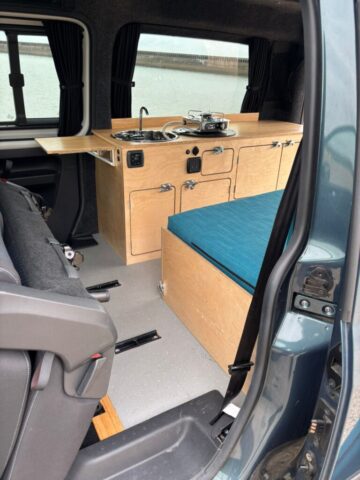 This fully equipped camper van is perfect for adventure. It currently sleeps two people, with the option to add a roof bed to accommodate up to four. The innovative design utilizes the original front seats to create the main bed, making it ideal for carrying up to four passengers.